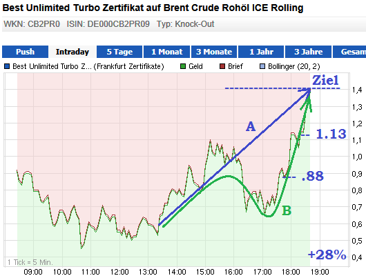 Ja, ist ja auch nicht verkehrt, dass du einen langen Ansatz fährst, wieso nicht. Ich handele nur intraday und habe abends nichts mehr offen, so kann man beruhigt schlafen und mindestens 30% / trade Wunschziel reichen allemale, egal bei welchem Einsatz, damit kann man sehr gut leben. Heute bin ich hinter den Möglichkeiten zurückgeblieben, nicht aufgrund von Fehleinschätzungen, dann wäre Öl gefallen statt gestiegen und würde jetzt nicht am Ziel stehen, sondern da man zwischendurch gezielt verunsichert wird, nicht alle oder viele sollen den ganzen Weg gehen. Das nächste mal werde ich versuchen es besser zu machen.