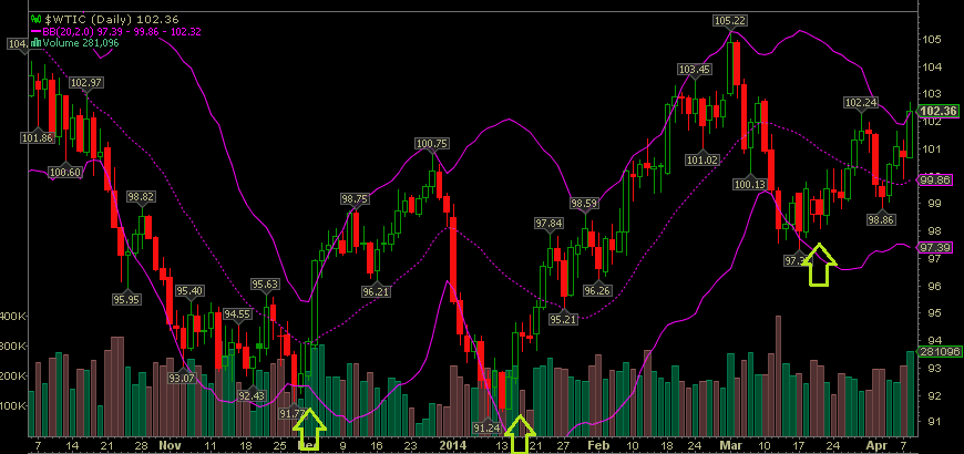 "Der Kurs war unter Ausbildung eines GAPs am unteren Bollingerband nach unten gelaufen und hatte sich dann vom Rand abgelöst." Man sieht die gleichen Muster wie bei Gazprom auch im Öl, hier sind die "Ablösephasen" mal markiert, kein Unterschied. Der Chart zeigt Öl über ca. 5 Monate. Dem eigentlichen Anstieg im Kurs ging logischerweise die "Ablösephase" voraus, universell verwendbar.