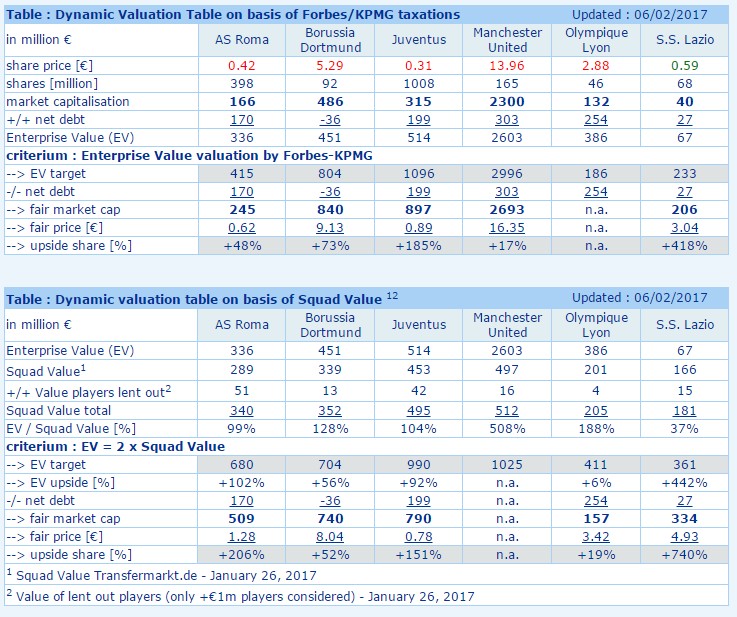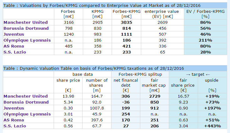 Auf Basis von Forbes und KPMG werden nun die Vergelichstabellen auf meine Seite kalkuliert und dann siehste das die Lazio noch sehr viel tiefer bewertet dasteht (also sehr viel mehr Nachholbedarf) als Juventus hat.