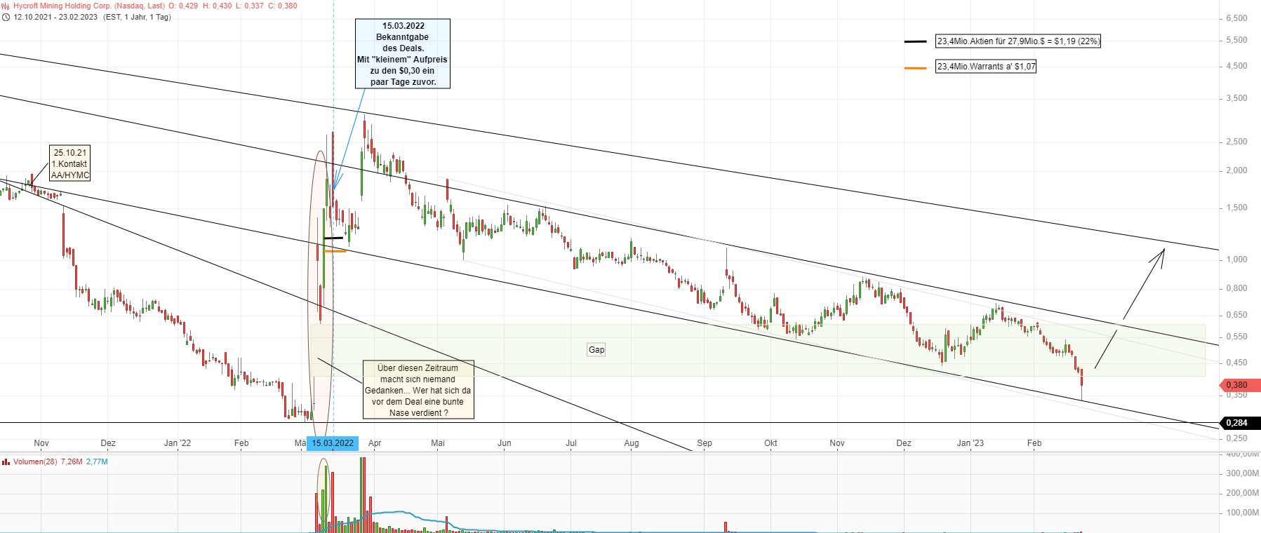 Nun ist der Kurs wieder dort angekommen, wo er vor 11 Monaten ein paar Tage vor dem 1,07 und 1,19- Deal von Hycroft und AMC und HedgeFunds-Kumpel Mudrick ungefähr stand.