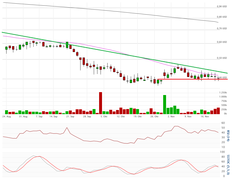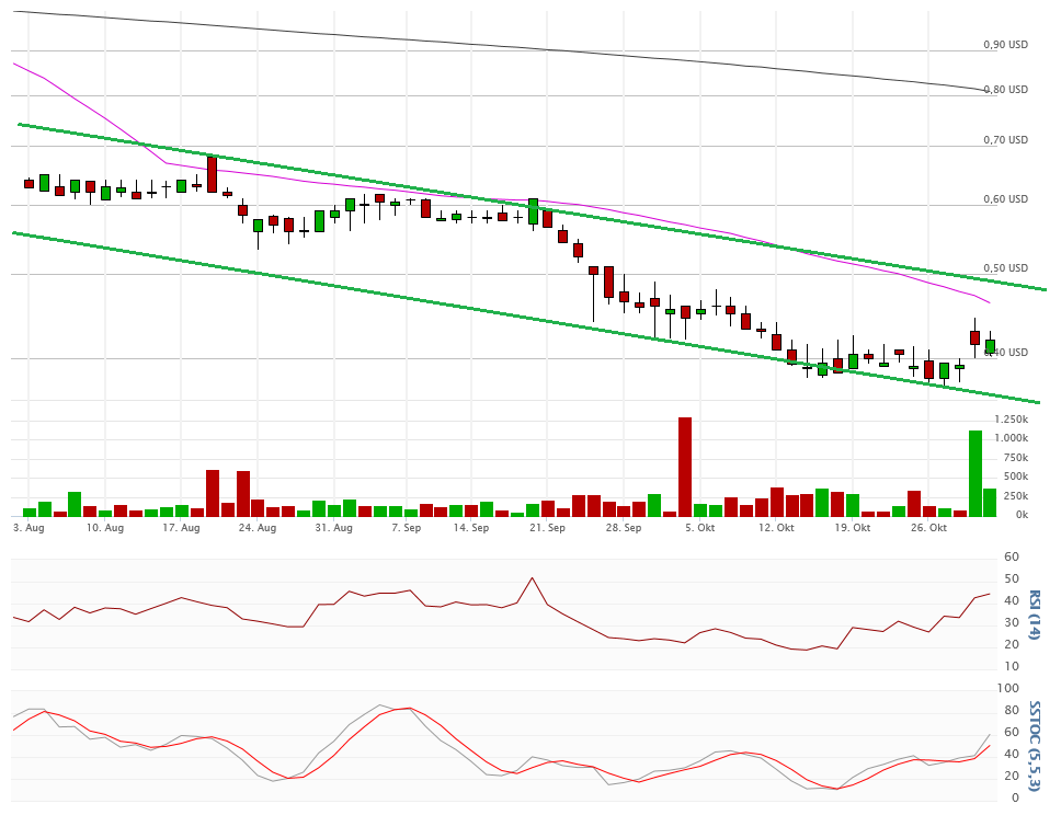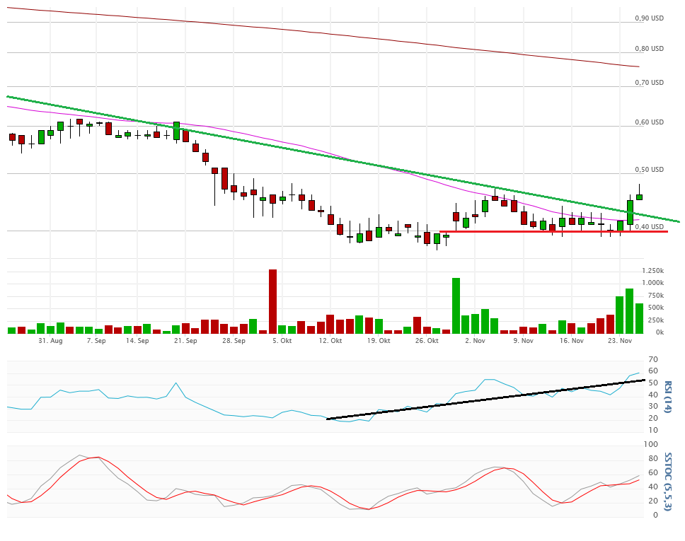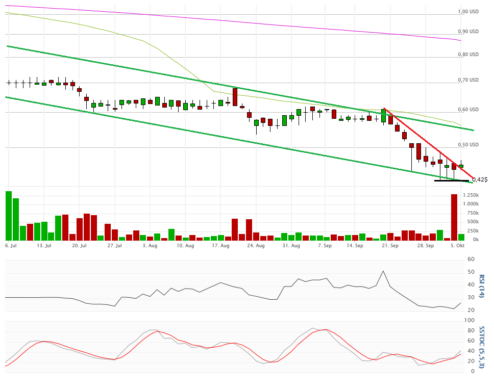 Der breite Abwärtstrendkanal bleibt natürlich weiter intakt. Erst über 0,54$ könnte sich ein richtig positives Bild entwickeln.