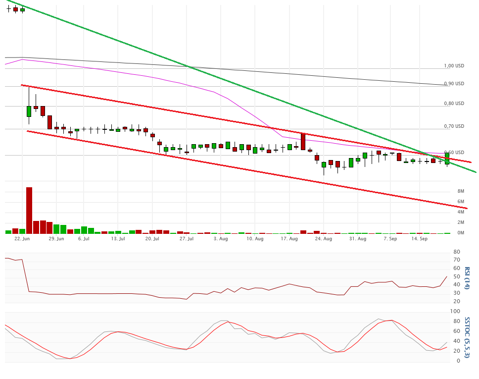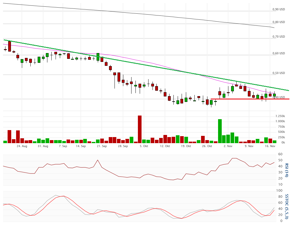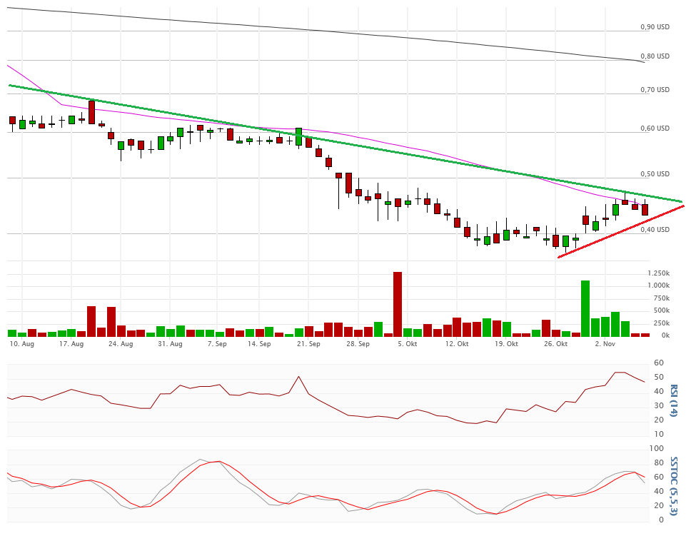 Unten hat mit dem Tagestief von 0,40$ die Unterstützung gut funktioniert. Mit hohem Volumen ging es dann über 0,43$, hier verlief heute die Abwärtstrendlinie, bis auf 0,46$. Dann der Retest des Ausbruchs mit dem Rücksetzer auf 0,43$. Am Ende bleibt 0,45$ stehen, Volumen über 900000 Aktien.