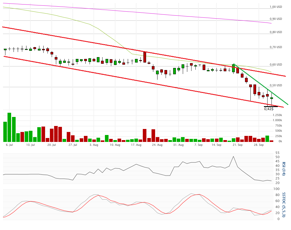 Der Chart zeigt es: Bei 0,44$ verlief gestern die Kanalunterbegrenzung. Und genau hier drehte die Aktie wieder nach oben. Wäre das Volumen hoch gewesen, könnte man von einem charttechnischen Hammer sprechen. Aber das Volumen war eher unterdurchschnittlich, wenn auch leicht erhöht, mit knapp 300000 Aktien.