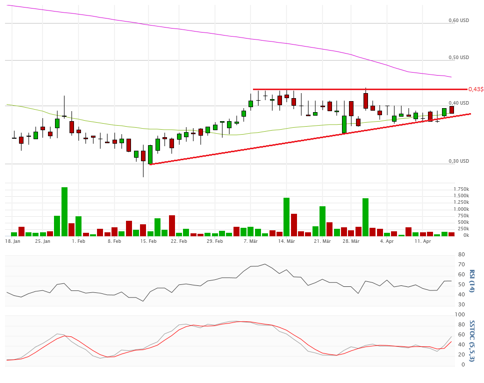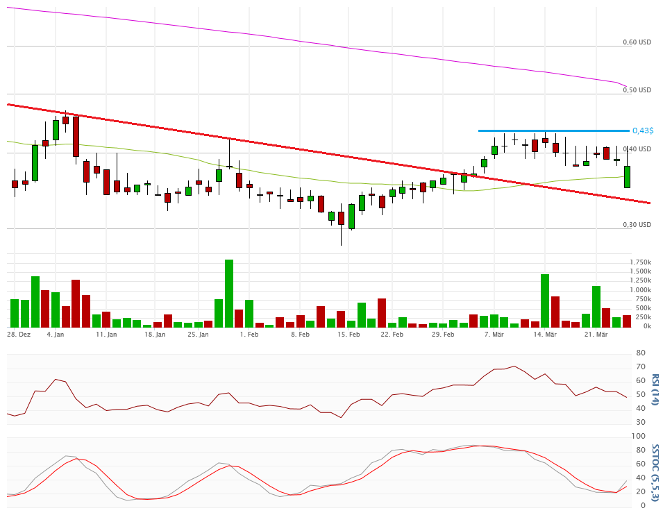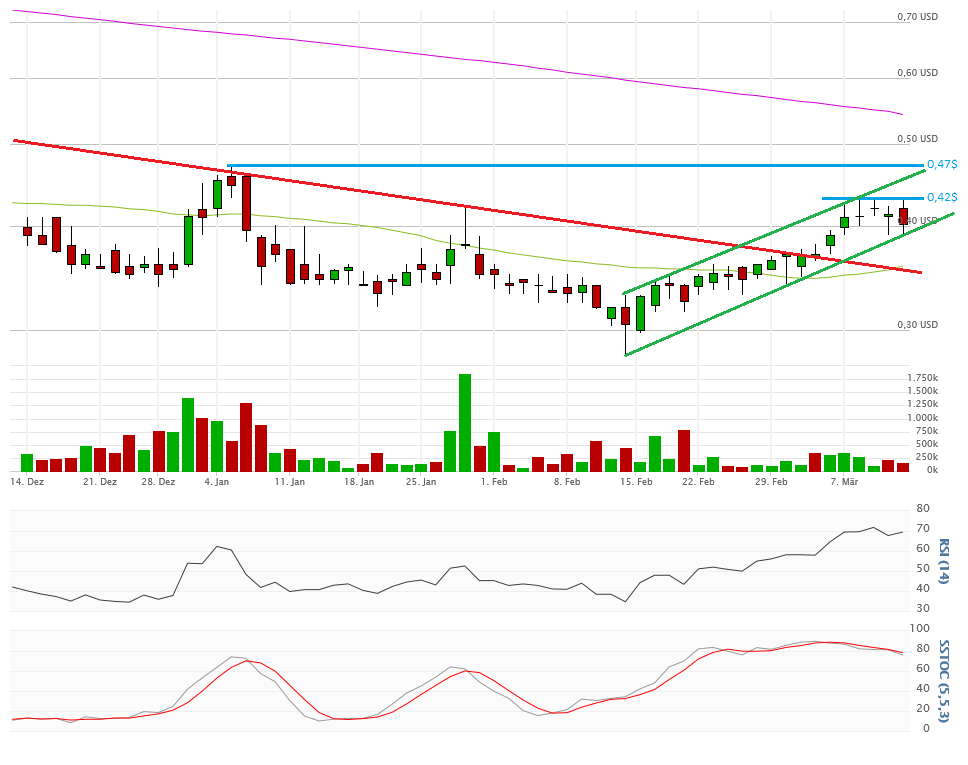 Zuletzt am Donnerstag eröffnete die Aktie mit einer großen Abwärtsgap von 10% bei 0,35$. Auf diesem Niveau wurde aber bei dieser Aktie zugegriffen. Ein Anstieg bis 0,41$ war die Folge. Wochenschluss 0,38$.