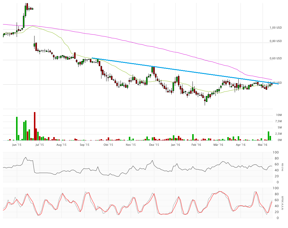 Im Moment scheint bei 0,43$ der Deckel drauf zu sein, zumal um 0,50$ noch die 200-Tage-Linie lauert. Über 0,50$ wird es bullisch - am Besten mit guten HSV2-Daten.