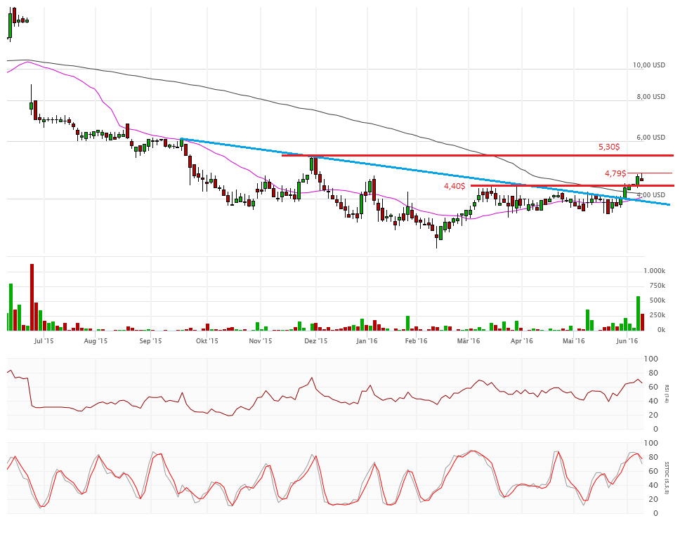 Charttechnisch hat sich natürlich nichts verändert. Die mehrmonatige Abwärtstrendlinie wurde seit meinem letzten Chart-Beitrag immer noch nicht übersprungen. Unterstützung gibt es bei 3,60$. Extrem schwierig wird es unter 3$.