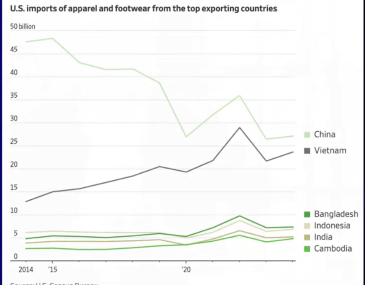 1. Extrem hoher US Zoll auf Nike- Produktionsstandorte. Habe gelesen, dass Nike allein in Vietnam verteilt auf 180 Firmen über 450-Tausend Mitarbeiter (unfassbare Zahl) beschäftigt. Ich weiß nicht ob da vorher überhaupt einen Zoll gab, aber der neue Zoll liegt nun bei 46%!!!. Das kannst man ja wohl kaum 1:1 an den Endverbraucher weitergeben. D.h., die Gewinnmarge wird spürbar sinken oder der Absatz wird aufgrund des höheren Preises einbrechen.