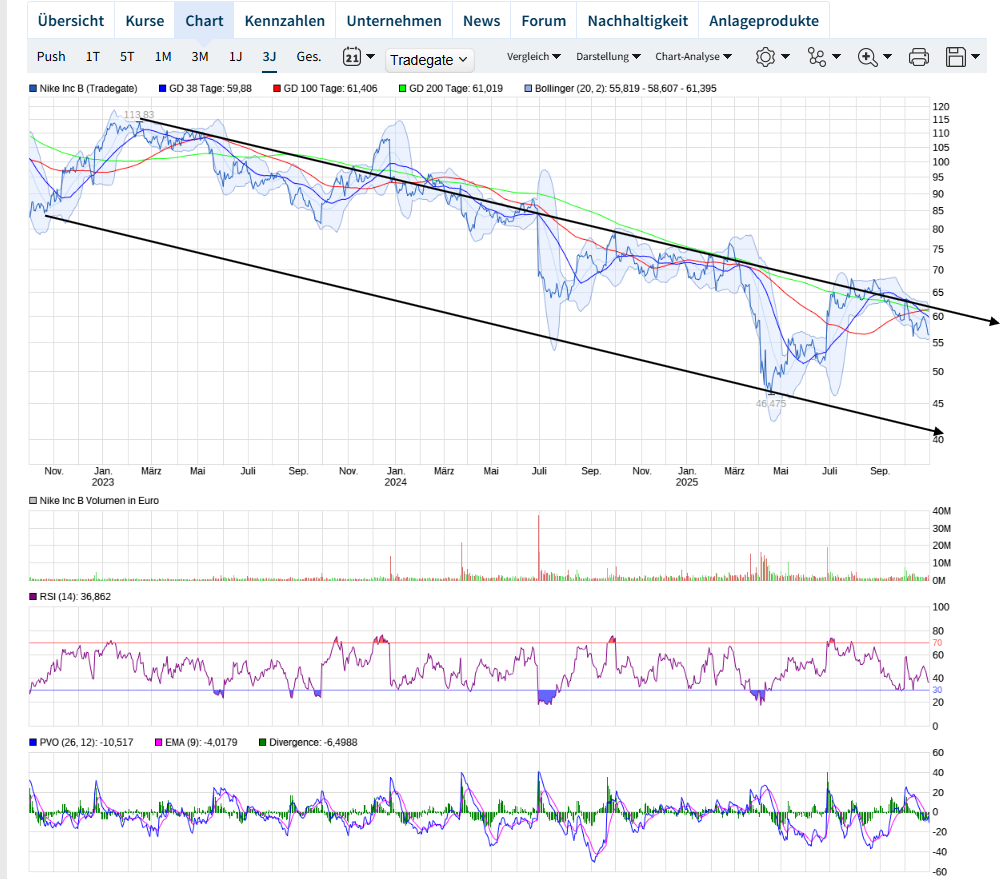 marathonläuf.: #964 wo würden die denn stehen wenn die Zahlen schlecht gewesen wären? =================================== Wichtige Zahlen waren schlecht. Der Kurs gibt nachbörslich ja nicht aus Spaß so deutlich nach. Der Markt interessiert sich nun mal berechtigterweise mehr für Marge bzw. Gewinn als für Umsatz. Und da hat Nike nicht hinreichend geliefert, z.T. selber verschuldet, z.T. aber auch schuldlos durch die Trump-Zölle. Von daher sind die Zahlen eben unter den Erwartungen. Und das reicht offenbar, um Leute wieder rauszukicken die nur auf kurze Strecke hier zocken. Somit mal abwarten, ob man sich morgen wieder etwas fangen wird, sobald diese Klientel raus ist. Bin gespannt, ob der seit April steigende blaue Abw.trend das Jahresende überleben kann.