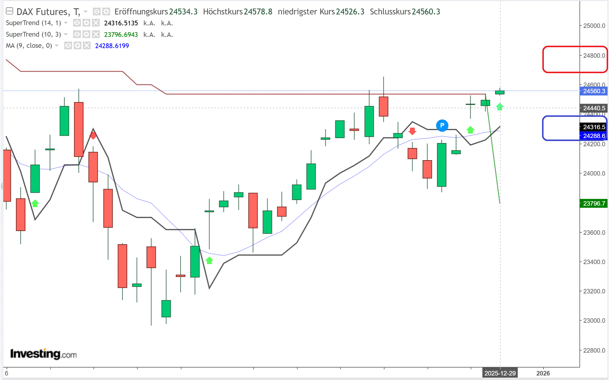 Der DAX ist seit 23.924 in der 2. Jahresendrallyphase unterwegs und kann noch locker den Re-Test der markanten Horizontalhürde bei 24.479 schaffen. Vorbörse taktet bei 24.400, also fester. Die zu nennende erste DAX Tagesunterstützung für Montag, den 29.12.25, ist 24.350. Eine zweite DAX Unterstützungszone befindet sich bei 24.320/24.305. Eine noch größere DAX Unterstützungszone stellt heute der Bereich 24.200/24.190/24.170 dar. Selbst wenn der DAX vor dem Erreichen von 24.479 nochmal abbricht und etwas umfassender fällt, so gäbe es ab 23.924 oder 23.615/23.420 weitere Chancen, um gegen die Hürde 23.479 zu laufen (Stoploss 22.843-x)."