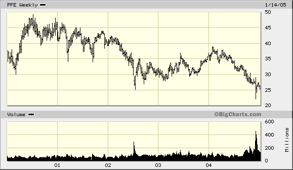 As if it weren't enough that $14 billion worth of annual sales could be lost to generic competition over the next several years, there is also the ill portent of the COX-2 inhibitors, Celebrex and Bextra. Studies have linked these drugs to heart attacks. In the fourth quarter, sales of both were strong, up 24% and 53%, respectively. But raw prescription data shows another story, with the number of new scripts for each drug plummeting since worries about Celebrex arose in mid-December.