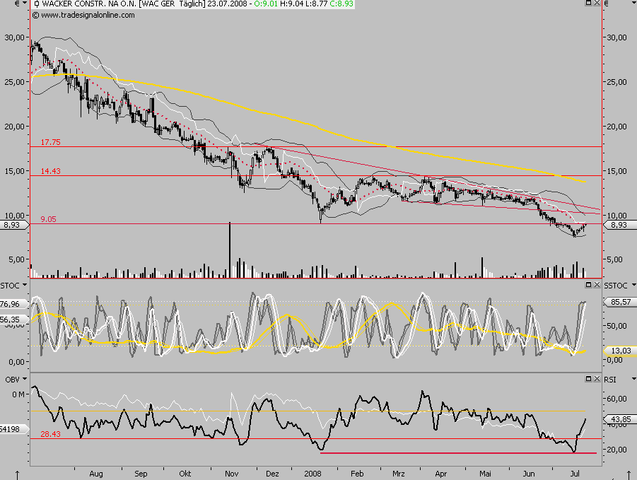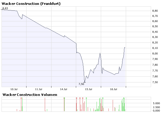 Die Aktie von Wacker Construction notiert derzeit in Frankfurt bei 7,45 Euro (-7,22 Prozent). (31.07.2008/ac/n/nw)