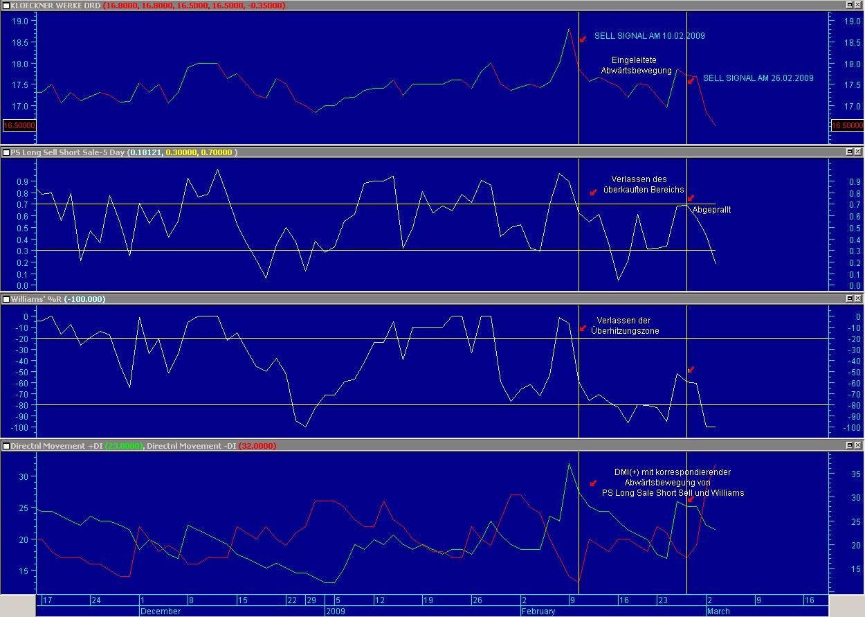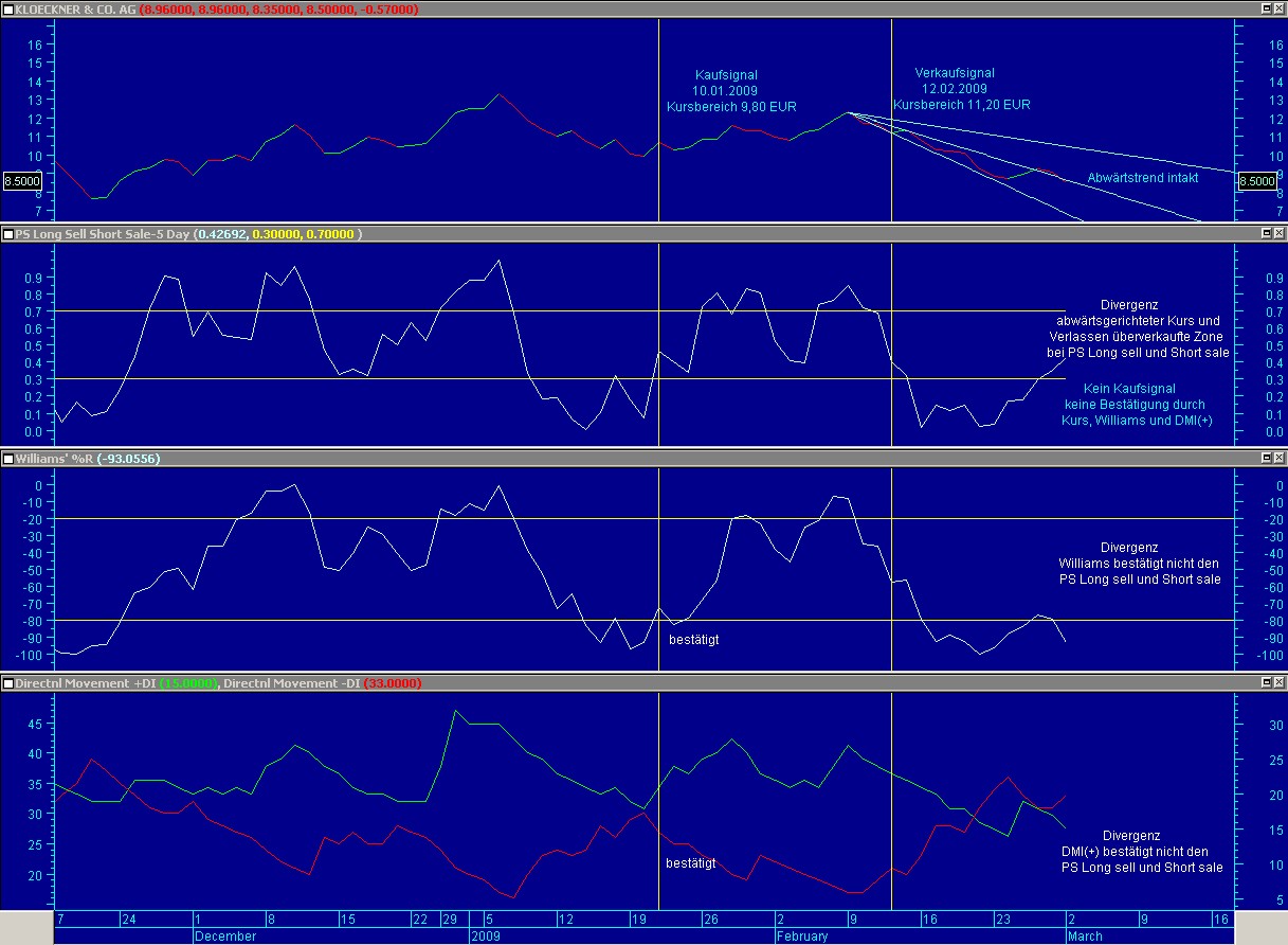 Bei Klöckner war am 10.02.2009 ein SELL-SIGNAL generiert. Grund war der Kursrückgang der Aktie zum einen, begleitet von der Abwärtsbewegung des PS Long Sell Short Sale in den neutralen Bereich, der signifikanten Abwärtswegung des Williams ebenfalls in den neutralen Bereich und parallel dazu die Abwärtsbewegung des DMI(+). Alle drei Signale bewegen sich in die gleiche Richtung (starkes Verkaufs-Signal). Was sich rückblickend auch bewahrheitet hat.