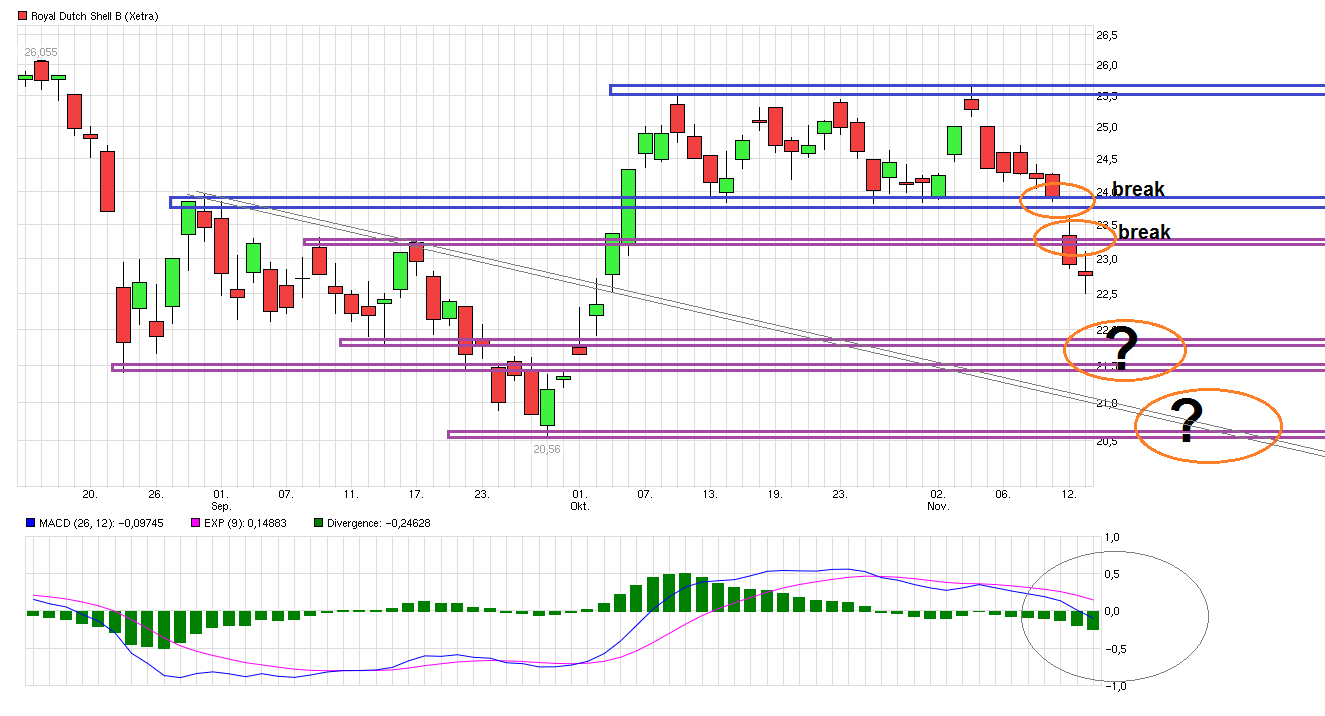 Der Ölpreis fällt aktuell wieder, und es drücken Überkapazitäten in die Märkte. Wer keine Verarbeitung vornimmt, hat's besonders schwer und muss deshalb den Preis nachlassen. Intern: Unrentable Tankstellen werden schon geschlossen - zwecks Risikominimierung, und weil langfristig die Nachfrage nach Benzin und Diesel abnimmt. TS-Schließungen von Total und Shell - hier zu beobachten im Westen. Harte Zeiten und das geht nicht spurlos an den Öl-Multis vorbei. Ich denke, wir sehen nochmals 22 Euro bis Februar 2016. Die Ergebnisse für das n e u e Quartal dürften aufschlussreich sein. ... Bis bald.