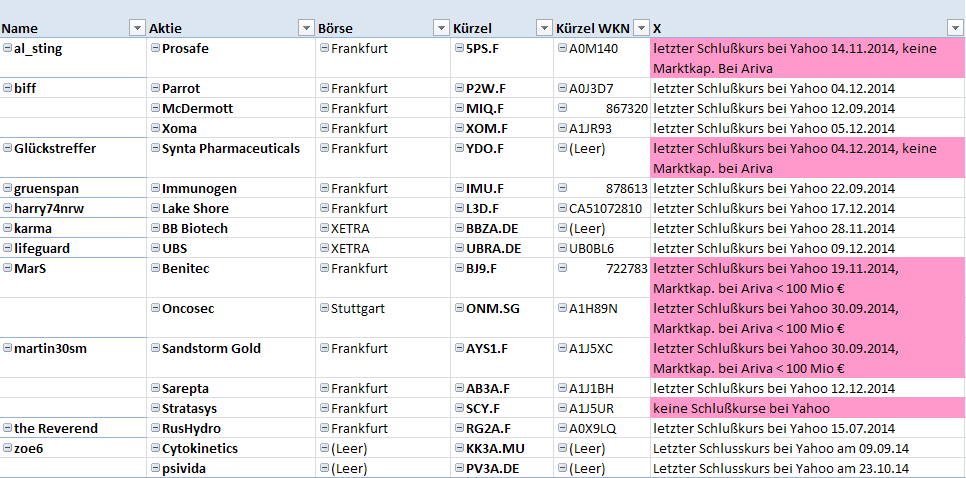Am Besten wäre es, ihr liefert mir Ersatzwerte, bei denen die Ummsätze an den deutsche Börsenplätzen ausreichend hoch sind. Morgen hoffe ich, die Betroffenen Werte hier anzeigen zu können.