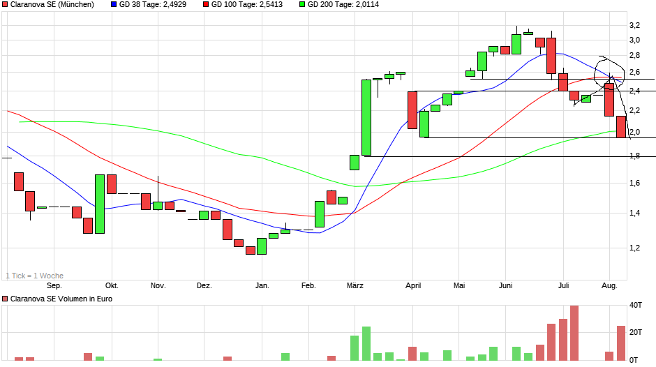 Bei unserer Diskussion vor ein paar Wochen war halt die starke Unterstützung bei 2,22-2,24 € intakt. Ich spekuliere dann nicht darauf, ob sie vielleicht zwei Monate später durchbrochen wird. Genauso wie ich jetzt nach Bruch der Unterstützung nicht darauf spekuliere, dass die nächste Unterstützung bei 1,82-1,87 € durchbrochen wird. Das hat auch nichts mit meiner fundamentalen Meinung zu tun, auch wenn das am Ende natürlich eine Rolle bei der Frage spielt, wann ich zukaufe oder teilverkaufe.