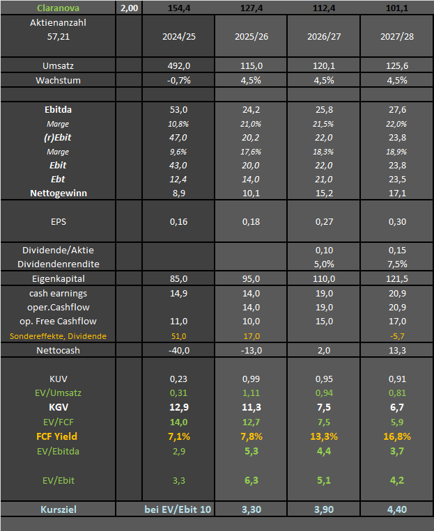 Und das genau ist doch der Investment Case bei ClaraNova. Hier fallen Zinsaufwendungen und Zinstilgungkosten in erheblicher Höhe weg. Es fallen aber natürlich auch die operativen Gewinne von Planet Art weg, die aber deutlich geringer sind. Hinzu kommt der Schuldenabbau, der das EV entsprechend positiv für die Aktienbewertung beeinflusst. Wieso der Markt das nicht so sieht, weiß ich nicht. Aber okay, wenn alle Anleger so denken wie du, wäre das eine Erklärung. Andere Erklärung wäre, dass man nicht an Wachstum glaubt. Aber selbst fürs laufende Jahr hat man ein KUV von 0,95 und eine EBIT Multiple von unter 6. Und das für ein Softwareunternehmen mit 20% Marge. Das ist doch absurd.