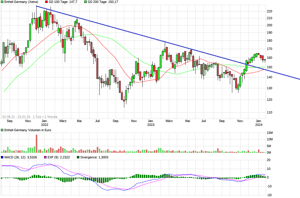 Also 150 vielleicht nochmal, wo gleitende DS und ehemaliger Downtrend verlaufen, aber viel tiefer glaub ich nicht. Da müsste Einhell 2024 schon bei Umsatz und Eregbnis schrumpfen. Ist jetzt aich nicht völlig ausgeschlossen, aber 2023 war ja schon belastet, so dass die Basis nicht besonders hoch ist.