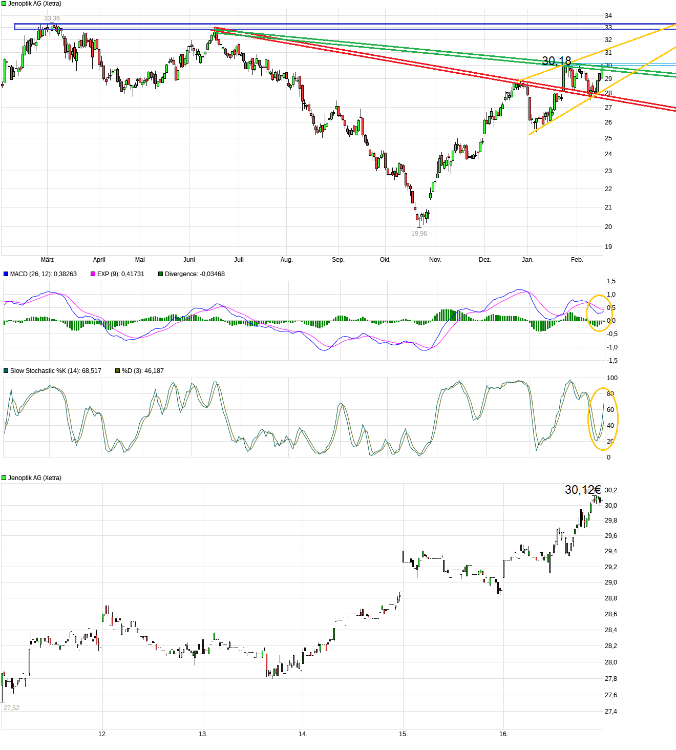 Kurs ist heute bis auf 6 Cent wieder an das Top vom Januar (30,18€) rangelaufen. Indikatoren sehen eigentlich auch gut aus. Bin also mal gespannt, ob es kommende  Woche gelingt  den  Widerstand rauszunehmen. Dann wäre aus meiner Sicht nach oben ca. 3€ Luft wieder frei. Aber erstmal einen Schritt nach dem anderen. Kann ja  auch sein der Durchbruch wird wieder geblockt.