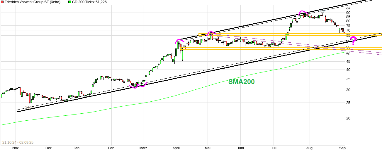 hannes10: #1126 "...Wann beruhigt sich das Gemetzel wieder? Wann ist ein solider Wert des Unternehmens erreicht?.." =============================== Solche Fragen kann keiner wirklich beantworten. Die Aktie ist in relativ kurzer Zeit , d.h. in ca. zwei Jahren, um ca. 1000% gestiegen. Da ist doch klar, daß irgendwann auch mal die Gewinnmitnahmen kommen müssen, wenn die Kursentwicklung zu viel zu schnell schon an Zukunft eingepreist hat. Wenn ich auf den Chart schaue, dann wäre es z.B. denkbar man pendelt jetzt bis zur Unterseite des schwarzen Trendkanals. Parallel steigt auch die SMA200 stetig weiter an. Wäre auch vorstellbar, daß diese Linie noch ein gewisse Anziehungskraft haben wird. Nach sehr starken Anstiegen sind meistens anschließende Konsolidierungen auch ausgeprägter. Insgesamt ist aber natürlich auch wichtig, daß das ganze Börsenumfeld weiter mitspielt. Denn wenn es den Gesamtmarkt mal tiefer runterziehen würde, dann wäre eine noch immer hoch bewertete Aktie wie Vorwerk nicht imun. Von daher eben wie jede Aktie ein Risikoinvestment, wo jeder für sich entscheiden muß ob und wo er Absicherungen festlegt, um Verluste zu begrenzen. |