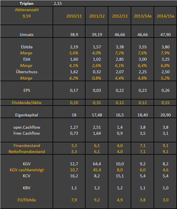 DGAP-News: TRIPLAN AG: +++ Veröffentlichung vorläufiger Zahlen für das Geschäftsjahr 2013/2014 +++ 16.12.2014 / 13:49 Bad Soden, den 16. Dezember 2014: Die TRIPLAN AG veröffentlicht die vorläufigen Zahlen für den Konzernabschluss des Geschäftsjahres vom 1. Oktober 2013 bis zum 30. September 2014. Mit dem bevorstehenden Wechsel des Geschäftsjahres auf das Kalenderjahr werden zum letzten Mal die Geschäftszahlen für einen Zeitraum von Oktober bis September bekanntgeben. Das letzte Quartal des Kalenderjahres 2014 wird somit ein Rumpfgeschäftsjahr sein. Parallel zu dieser grundlegenden Veränderung hat die TRIPLAN AG für den Konzernabschluss den Rechnungslegungsstandard von IFRS auf HGB gewechselt. Aufgrund der weitestgehend angenäherten Rechnungslegungsregeln ergeben sich nur geringe Auswirkungen in der Gewinn-und Verlustrechnung. Die Darstellung der Bilanz ist maßgeblich durch die fortgeführte Abschreibung der Geschäfts- und Firmenwerte, im Wesentlichen gegen den Bilanzgewinn, geprägt. Dies sorgt als Resultat für einen Rückgang der Bilanzsumme gegenüber dem Rechnungslegungsstandard nach IFRS Der Konzern erwirtschaftete Umsatzerlöse von 43,8 Mio. EUR nach gut 46,7 Mio. EUR im Vorjahr. Auf der Basis der HGB-Rechnungslegung wurde ein vorläufiges EBIT von 2,6 Mio. EUR (Vorjahr: 2,6 Mio. EUR) erzielt. Die vorläufige EBIT-Marge stieg somit leicht von 5,6 Prozent auf 5,9 Prozent. Bei einer Bilanzsumme von 22,3 Mio. EUR zum Bilanzstichtag 30. September 2014 (Vorjahr: 21,2 Mio. EUR) beläuft sich die Eigenkapitalquote der Gesellschaft auf 63,7 Prozent nach 58,0 Prozent zum 30.09.2013. Der Bestand an liquiden Mitteln stieg zum 30. September 2014 auf 6,3 Mio. EUR (Vorjahr: 4,0 Mio. EUR). Mit den vorgelegten Zahlen hat TRIPLAN die Nachhaltigkeit seiner strategischen Entwicklung in einem schwierigen Marktumfeld belegt. Bei der Erreichung der gesetzten Ziele steht immer die Profitabilität des Handelns der TRIPLAN Gruppe im Vordergrund. Die TRIPLAN Gruppe strebt weiterhin eine sukzessive Steigerung des Umsatzvolumens, mit einem größeren Marktanteil im internationalen Projektgeschäft, an. Hierfür stellen die in diesem Geschäftsjahr getätigten Investitionen in unser patentiertes Closed Coke Slurry System und der Aufbau des Tochterunternehmens in Pune/Indien die Grundlage dar. Der vollständige Geschäftsbericht der Gesellschaft wird am 25. Februar 2015 veröffentlicht und dann im Internet unter www.triplan.com > Investor Relations > Berichte verfügbar sein. (Link: http://www.triplan.com/investorrelations/berichte.html) TRIPLAN AG Der Vorstand |