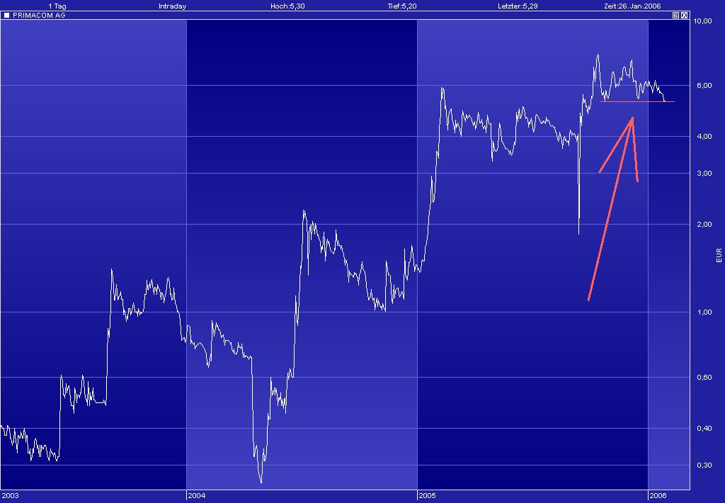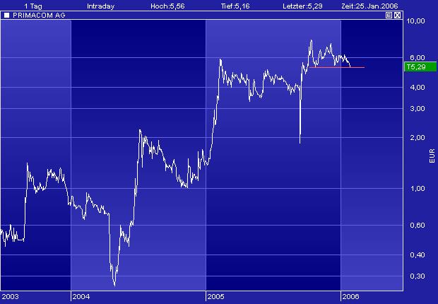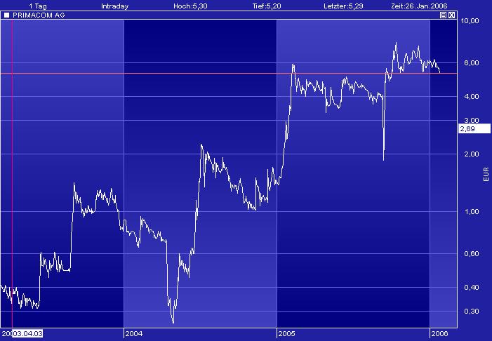 "obwohl börsennotiert, steht primacom --branchenbedingt-- im focus der finanzinvestoren (private equity) und hat sich für finanzinvestoren geöffnet (Och Ziff) mit dem kauf und verkauf mittlständischer unternehmen werden derzeit hohe renditen von bis zu 30 % erwirtschaftet, " 2005 und 2006 sind erntejahre" (so der vorstandssprecher der Deutschen Beteiligungs AG (DBAG) gestern bei der der bilanzpräsentation) die börsennotierte DBAG, eine der ältesten deutschen private-equity-gesellschaften, führte lange zeit ein mauerblümchendasein, in den vergangenen wochen aber zog der kurs der DBAG an und liegt jetzt deutlich über dem nettovermögenswert (net asset value, NAV) der beteilgungsgesellschaft primacom hat einen NAV von 10 € je aktie, notiert aber rd 50 % unter dieser --nicht nur für beteiligungsgesellschaften wichtigen-- kennzahl dieses ungleichgewicht von innererem wert und börsenwert wird, nicht von dauer sein solche fehlbewertungen (bei primacom ausgelöst durch sog verleider-verkäufe und den damit verbundenen abbröckeln des charts und abgang der kleinspekulanten) korrigiert die börse früher oder später, das war schon immer so und wird so bleiben ... "