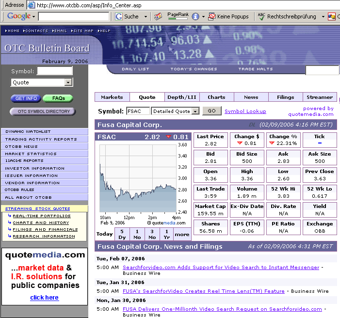 Im Jahr 2004 seien weltweit bereits 14 Milliarden Videos über das Internet konsumiert worden. Die Experten würden schätzen, dass die Zahlen im Jahr 2005 noch auf über 21 Milliarden steigen würden. Für 2007 würden sogar über 35 Milliarden prognostiziert. Der Bereich, in dem FUSA Capital tätig sei, zeichne sich also durch explosive Wachstumsdynamik aus. Die Steigerungsraten würden bis zu 48% pro Jahr betragen.