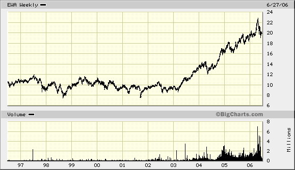 4.) The fierce selloff in emerging markets has driven speculators back to the dollar as a safe haven. Some may insist that the Swiss frank is the currency of choice for a safety bet, but the dollar took on some of that mystique last week when Zarqawi was captured and after the U.S. and Iran agreed to talk about Iran's nuclear enrichment program, says Laidi. Emerging markets suffered another brutal decline Monday and Tuesday. Hong Kong's Hang Seng Index fell 2.48% Tuesday, while Brazil's Bovespa fell 2.11%, and Korea's Seoul Composite Index dropped 2.90%.