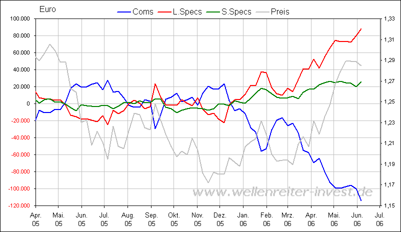 Selbst bei Seitwärtsbewegung entsteht Druck, weil die Futures eine Zinskomponente enthalten (das Geld ist ja größtenteils geliehen). "Dollar-short" zu sein lohnt sich daher nur, solange der Dollar dynamisch fällt - eine Marktsituation, in der die Zinsverluste durch schnelle Kursgewinne überkompensiert werden. Bei Seitwärtsbewegung oder gar Dollar-Kursanstiegen geht diese Rechnung nicht mehr auf.