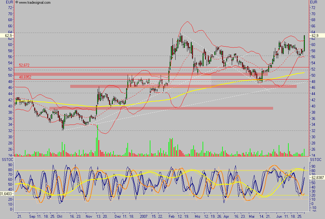 Ich bin bei 52,25€ rein. In der Erwartung, den Ausbruch über 53,30€ mit zumachen und Kurse über 60 € zu sehen. Der Ausbruch ist geglückt, und von mehreren Indikatoren kommen Kaufsignale. Fällt Conergy wieder unter 53,30 muss ich aufgrund meiner Erwartung den Sack zu machen.