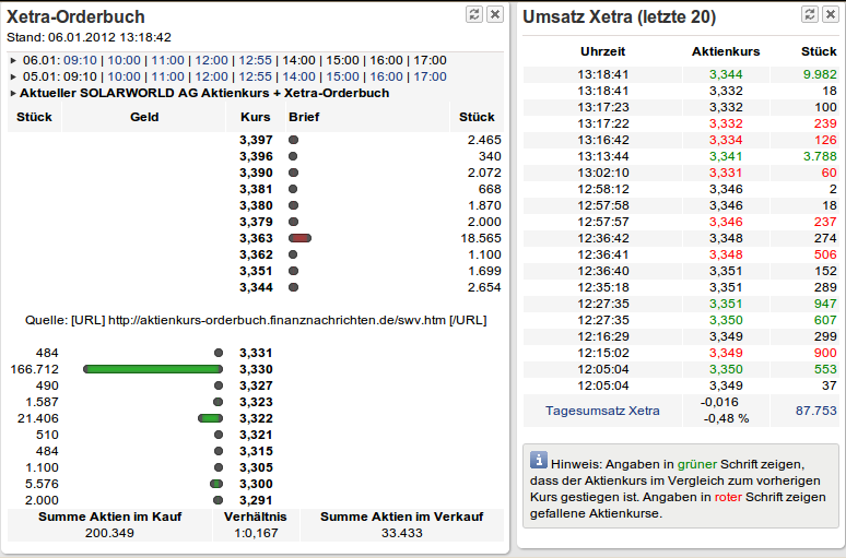 Ausgangspunkt (wie aktuelle): Kurs bei sagen wir mal 3,35. Jetzt will ich schlau sein, schaue in den Ordermanager und sehe Verkaufsorder 166.700 St. bei 3,33 von nennen wir ihn "MisterX".