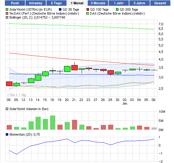 Das ist ja nun nicht der Fall, wenn man den letzten Monat betrachtet läuft SW ganz ordentlich. Mit einem kleinen Anschub von unserem Großinvestor kann darüber hinaus bald die 100-Tage-Linie gekreuzt werden und schon ist Solarworld plötzlich wieder ein klarer Kauf in jedem Börsenbrief. Wenn alle schön in den Markt kaufen finden sich dann auch wieder zahlreiche neue Käufer, da die Renditechancen steigen.