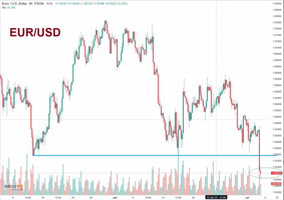 ...Nun bewegt sich der Euro [jedoch] auf einem historisch niedrigen Niveau. Am Montag erreichte er die Parität zum Dollar, ein Euro ist dieser Tage einen Dollar wert – Tendenz weiter sinkend. Zur Erinnerung: Anfang des Jahres konnte man einen Euro noch gegen 1,14 Dollar eintauschen.