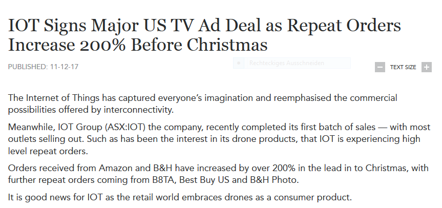 Das Interesse an seinen Drohnenprodukten hat IOT zu einem sehr hohen Nachbestellvolumen geführt, wobei die Bestellungen von Amazon und B & H vor Weihnachten um mehr als 200% gestiegen sind. Weitere Nachbestellungen von B8TA, Best Buy US und B & H Photo sollten die Einnahmen des Unternehmens in die Weihnachtszeit und darüber hinaus bringen. Dieses Interesse steigt weiter, und die Produkte von IOT werden heute Morgen von der Frühstücks-TV-Serie Sunrise als "die heißesten Gadgets für Weihnachten 2017" hervorgehoben. Mit Blick auf das Jahr 2018 könnte IOT nach der Unterzeichnung eines großen US-Fernsehwerbungsvertrags, der seine Drohnenprodukte vor mehrere Millionen Menschen bringen würde, einen echten Schub bekommen. NCIS ist die am dritthäufigsten gesehene Scripted Show im amerikanischen Fernsehen mit durchschnittlich 10 Millionen Zuschauern in den USA und einer weltweiten Zuschauerzahl von fast 50 Millionen. Superior Donuts ist eine US-amerikanische Sitcom mit einer durchschnittlichen Zuschauerzahl von 5 Millionen pro Folge. Werbung für dieses Publikum wird sicherlich ein großes Bewusstsein für IOT-Produkte bringen. Die Informationen in dieser E-Mail sollten nicht der einzige Auslöser für Ihre Investitionsentscheidung sein. Klicken Sie auf den unten stehenden Link, um eine gründliche und fundierte Untersuchung des Unternehmens durchzuführen. Wir empfehlen Ihnen dringend, bei finanziellen Investitionsentscheidungen professionelle finanzielle Beratung zu suchen. Kaum eine Woche nach der Veröffentlichung seiner AirSelfie- und ROVA-Produkte in den Geschäften hatte IOT alle seine Aktien verkauft und kämpft nun, um Bestellungen rechtzeitig zu Weihnachten zu erledigen. Wenn das Interesse an den Produkten von IOT in diesem Tempo weiter wächst, könnte das Unternehmen mit einer Obergrenze von 7 Millionen US-Dollar einen längeren festlichen Beifall genießen.