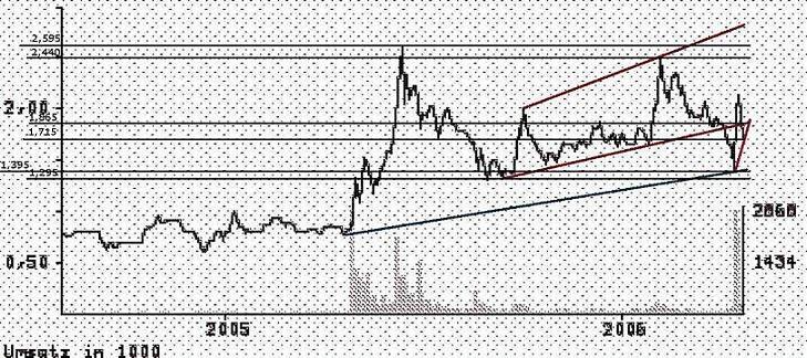 Wohl aufgrund der "hot news" ging es dann wieder steil bergauf (rote Linie) bis auf 2,61 (Tageshoch am 10.05.2006 lt. ING-DiBa, Umsatz: 1.7 Millionen Stück), womit der Kurs wieder in den alten Mifri-Trendkanal zurückkam. Leider hielt er sich dort nicht lange auf und brach wieder unterhalb die untere Grenze des Kanals ein.
