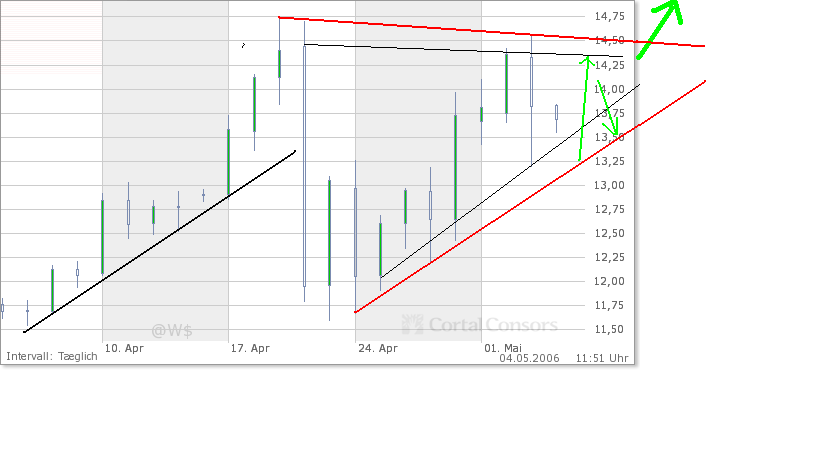 Rückblick: Im Wochenchart, der das übergeordnete Chartbild zeigt, ist der Rücksetzer vom 20.04.06 kaum zu erkennen. Der Tageschartausschnitt zeigt den Kursverlauf der vergangenen 10 Handelstage. Dieser Kursverlauf läßt sich formationstechnisch in ein hochgradig bullisches steigendes Dreieck eingrenzen, aus dem der Goldpreis heute zum Wochenende regelkonform nach oben ausgebrochen ist.