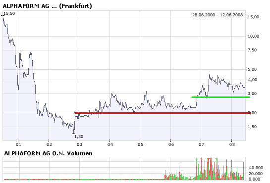 Den Chart, den du dort bemühst, kann man bei ATF nicht bringen, da damals bei der Seitwärtsbewegung zwischen 2,0 und 2,6 € noch die mittlerweile verkauften Geschäftsbereiche dazu gehörten. Alphaform ist bezüglich Kostenstruktur heute ein ganz anderes Unternehmen.