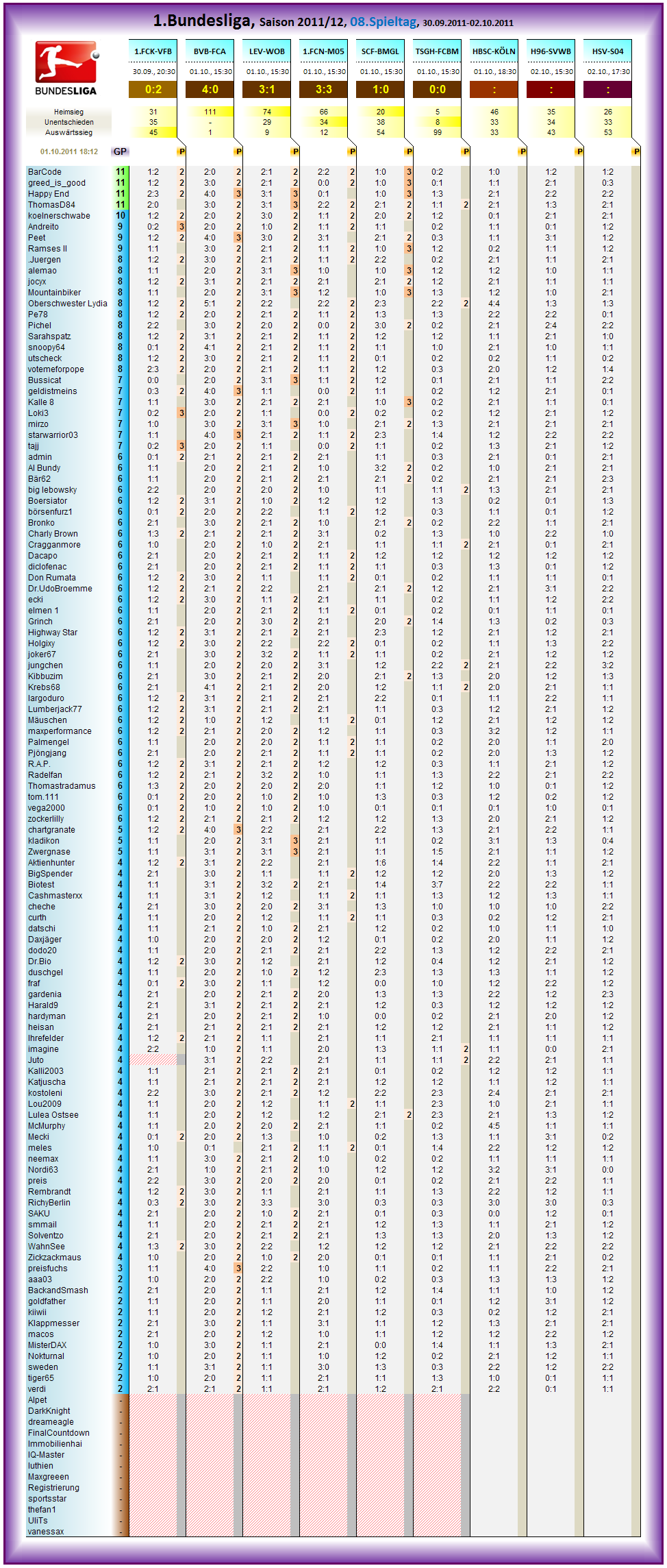Grinch oist übrigens in die Ewige Top 100 vorgestoßen und belegt eben nun den 100. Platz dort! In selbiger Liste hat es Charly Brown geschafft an diesem 8. Spieltag der Saison 2011/12 insgesamt die 1.000 Punkte Marke zu durchbrechen.. Momentan ist er auf Platz 38 in der Ewigen Liste..