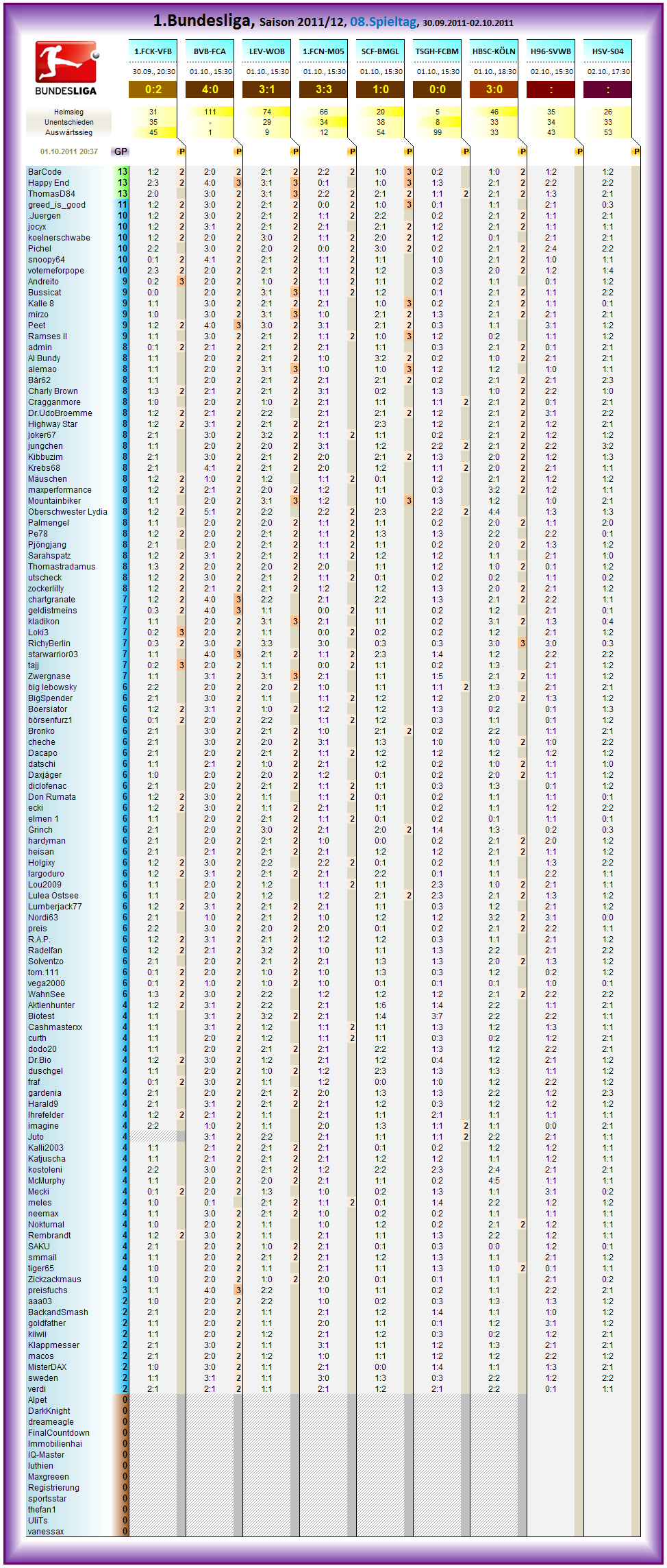 Guck de Richy an, trifft auch noch als Einzigster perfekt und heimst n Dreier ein.. jocyx, .Juergen und zockerlilly je zwei Punkte.. Un Du hast den Kopf wg letzten Spiel in Sand stecken wollen und hast noch so n bissl im Frust bestimmt auf Sieg Köln getippt..
