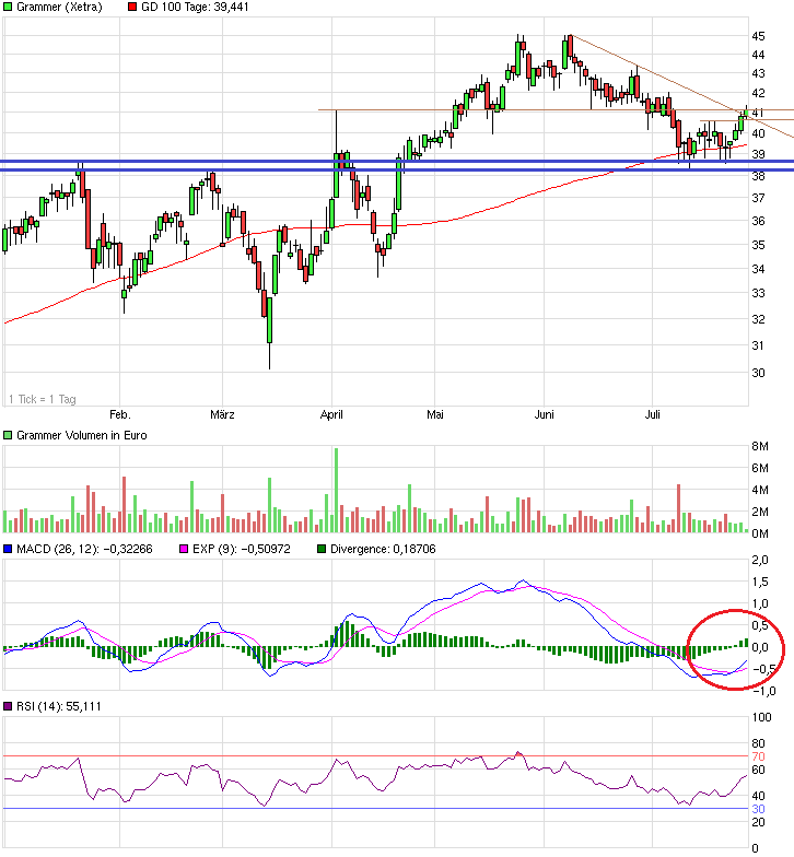 Sieht jetzt ziemlich gut aus. Wäre aber wichtig, sich über dem Bereich 40,6-41,0 zu etablieren. Formation und MACD sprechen dafür.