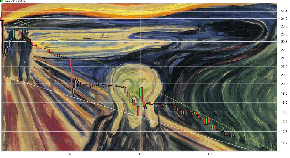 Wird Zalando vom "Anlagenotstand" profitieren, der Anleger angeblich noch immer weiter in Aktien treiben soll? Nein. Es gibt jede Menge Aktien mit einem besseren Risiko-Chance-Profil als Zalando, und außerdem, schaut euch an was an den Börsen los ist. Überall bröckeln gerade die Kurse.