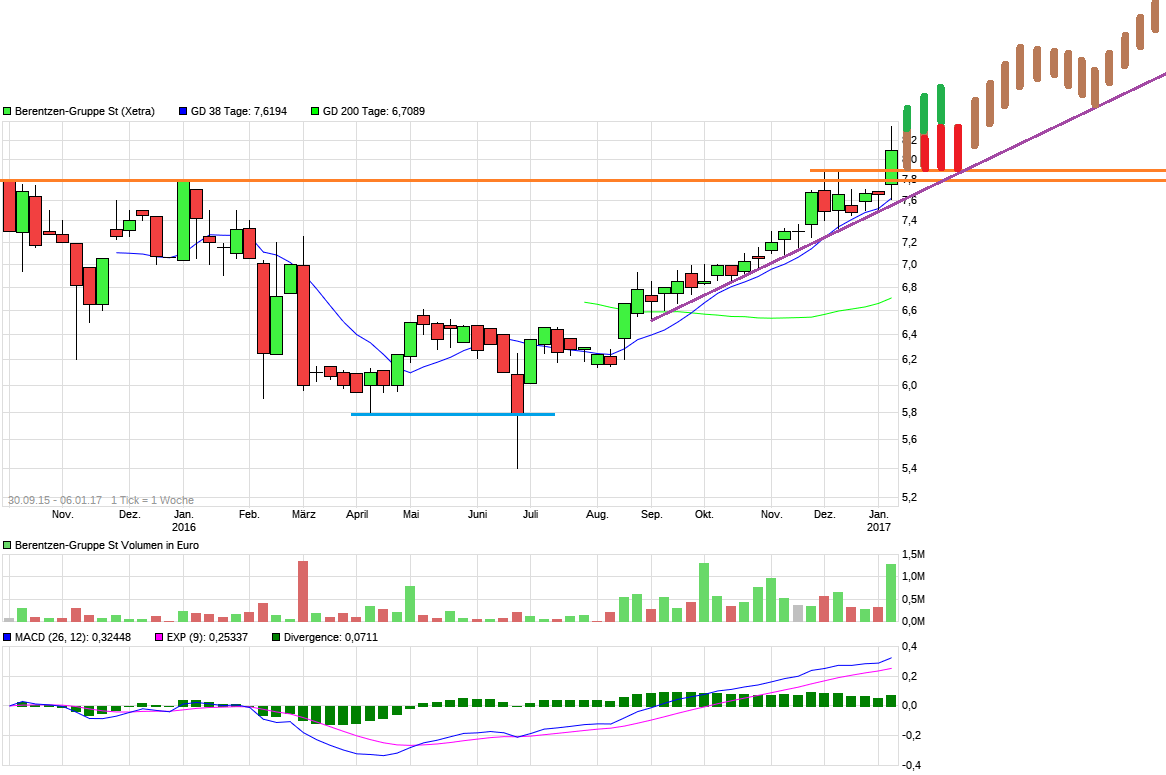 Berentzen weist im Zwischenbericht Q3/2016 um "Ergebnissondereffekte" bereinigte ergebniszahlen aus, eklaert die effekte aber nicht naeher, file:///home/chronos/u-2fec71bdb649c2d509ebb6ea26c0166b3c09e441/Downloads/2016_Zwischenbericht_Q3_26.10.2016.pdf aussagefaehiger sind die cash-earnings, Berentzen bezeichnet sie als "erfolgswirtschaftlichen Cashflow: 10,5 Mio. Euro": 9M_2016 mio EUR 10,5 cash-earnings /9,6mio aktien =1,09 EUR cash-eps 9M =1,45 EUR cash-eps 2016e (annualisiert) verhaeltnis kurs zu cash-eps liegt unter 6, die aktie ist also recht preiswert weniger schoen ist, dass in den 9M kein free cashflow erwirtschaftet wurde "Die ... Branntweinsteuer verursachte einen Nettomittelabfluss von 9,6 Mio. Euro, während im Vorjahresvergleichszeitraum hieraus noch ein Nettomittelzufluss in Höhe von 8,3 Mio. Euro generiert wurde" (Cashflow aus laufender Geschäftstätigkeit Mio. Euro +0,4 +Investitionstätigkeit Mio. Euro -3,6 = minus 3,2mio) dividendenspruenge sind also nicht zu erwarten auch die masszahl EV/Ebitda (2016e) von unter 5 ist guenstig und lockt aktienkaeufer an (berechnung: ((kurs 8.1 ×9.6mio aktien +49.7mio +0.4mio -57.8mio) / 15mio ebitda(unbereinigt) = 4.7) |