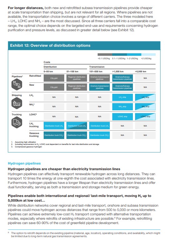" ... Da die Wasserstoffproduktionskosten sinken, sind die Kosten für die Übertragung und Verteilung die nächste Grenze, wenn es darum geht, die Kosten für den gelieferten Wasserstoff zu senken. Längerfristig bietet ein Wasserstoff-Pipeline-Netz die kosteneffizienteste Möglichkeit der Verteilung. Pipelines können zum Beispiel die 10-fache Energie zu einem Achtel der Kosten übertragen, die bei Stromleitungen anfallen, und haben ähnliche Investitionskosten wie Erdgas. Die Industrie kann die bestehende Gasinfrastruktur teilweise wiederverwenden, aber auch neu gebaute Pipelines wären nicht unrentabel (vorausgesetzt, Leckagen und andere Sicherheitsrisiken werden angemessen berücksichtigt). Wir schätzen zum Beispiel, dass die Kosten für den Transport von Wasserstoff aus Nordafrika nach Mitteldeutschland über eine Pipeline etwa 0,5 USD pro kg H2 betragen könnten - weniger als die Kostendifferenz der heimischen Produktion von erneuerbarem Wasserstoff in diesen beiden Regionen.