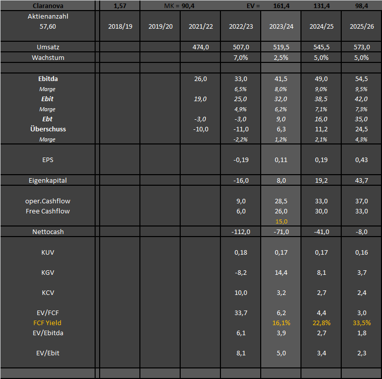 Ausblick hört sich natürlich super an, wenn das Ziel von über 500 Mio Umsatz bei 10% Ebitda Marge in 2024 geschafft wird. Da sind potenziell 20-23 Mio Überschuss und FCF drin, und das bei nur 85 Mio MarketCap. Aber es bestehen halt auch noch fast 100 Mio € Nettoschulden.