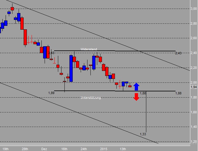 Also meine Handelsidee (ich werde nicht danach handeln): 1. Wenn die nächste Tageskerze bullisch ist, dann long einsteigen mit einem StopLoss knapp unter der Untertützung bei 1,80. Kursziel wäre dann ca. 2,40.