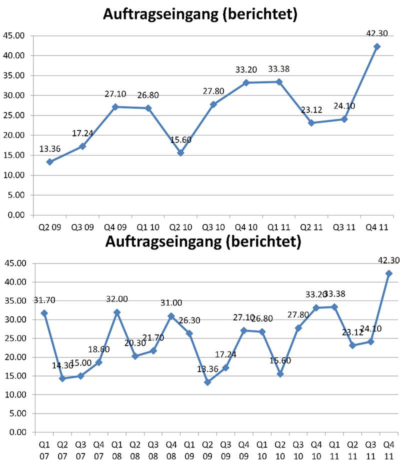 2. Auftragseingang/Umsatz: Q4 2011 Book-to-bill 1.41X. Auftragseingang auf Rekordniveau, siehe Charts. Spricht für starkes 2012.