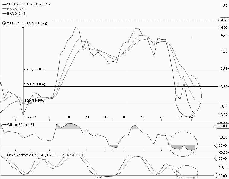 Charttechnisch gesehen ist der Trend seit dem 10.02.2012 bei SW „gerissen“. Die Indikatoren Williams und Slow Stochastic zeigen dies sehr deutlich. Dieser Abstieg erfolgte zudem relativ steil, d. h. das Kaufinteresse ließ plötzlich sehr stark nach.
