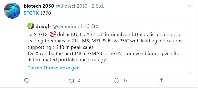 Wenns auf die 10€ zuläuft werde ich ohne News zukaufen, es ist einfach zu verlockend. In diesem Jahr kommen noch mehr Daten von TG und der Zulassungsantrag an die FDA wird vorbereitet.