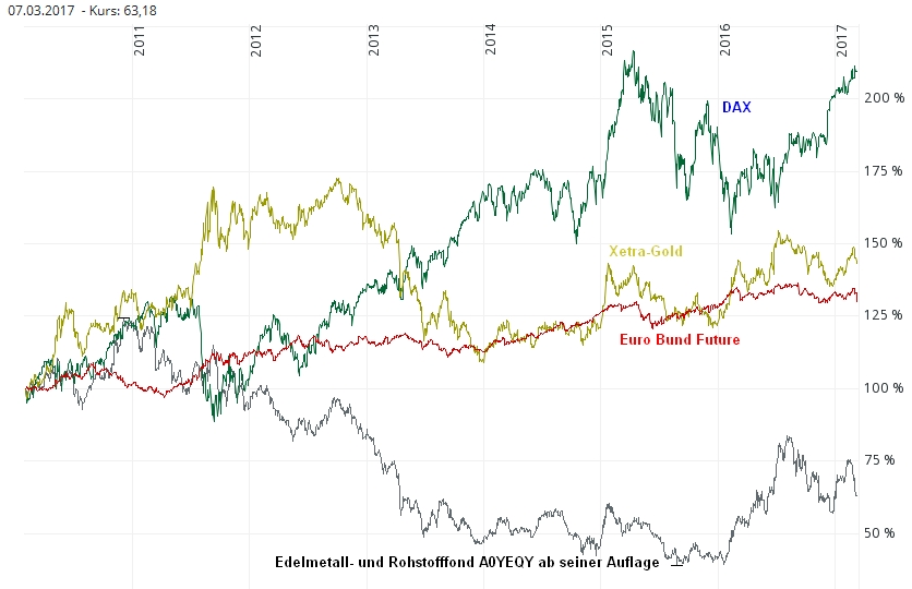 In #185 wollte ich übrigens zeigen das ein Fond eines "Experten" ( welcher auf einschlägigen Seiten ständig von den außergewöhnlichen Gewinnen der Edelmetalle sowohl in der Vergangenheit als auch in der Zukunft schwärmt) genüber so ziemlich allem anderen eine saumäßige Performance aufweist.