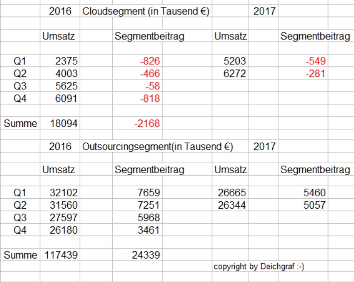 Sichtbar ist jetzt geworden,daß sich der Umsatzverlust beschleunigt hat ,Consulting/TK-Firmenkunden stagnieren und Cloud im einstelligen Mio.-Bereich nicht ausreichend wächst! - Ab Q3 muß der wegfallende Olympusumsatz auch noch zusätzlich kompensiert werden!
