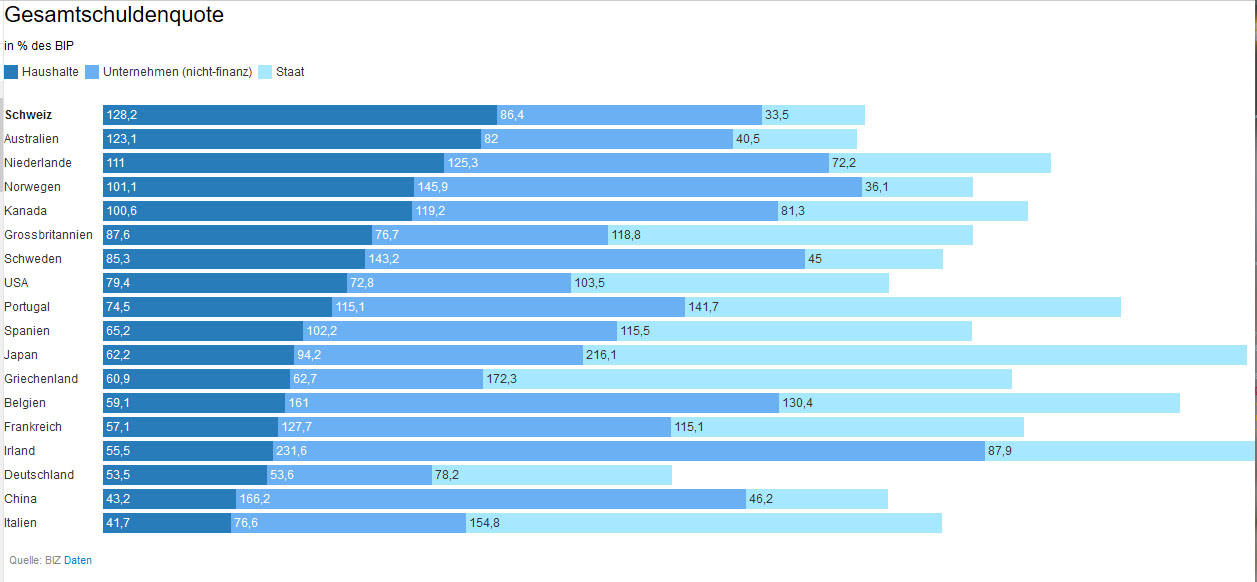 Eine zu hohe Privatverschuldung kann aber - im Zuge von Bankenrettungen - zu einer erhöhten Staatsschuldenquote führen. So hatte Spanien in den Nuller Jahren noch eine Vorzeige-Staatsschuldenquote von nur 40 %. Die Privaten (Firmen und Haushalte) hatten sich in der Immo-Blase jedoch stark überschuldet. Nach der Rettung der verzockten Banken, die unter nicht eintreibbaren Privatschulden litten, stieg Spaniens Staatsschuldenquote dann auf bis über 100 %.